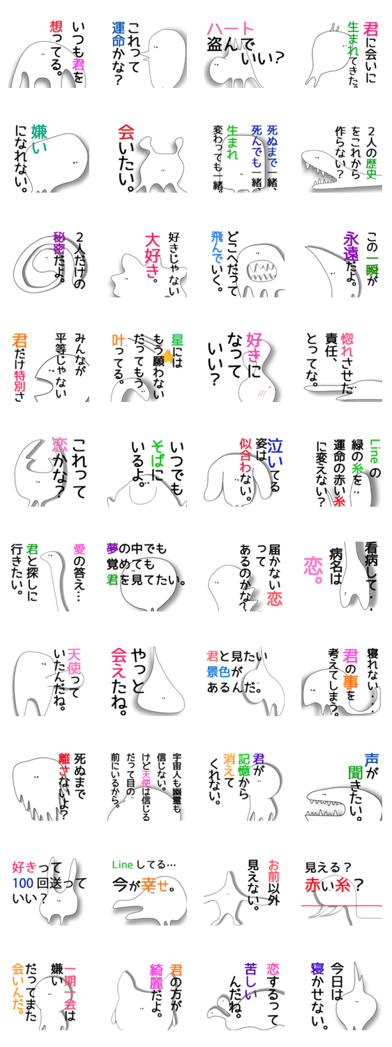 恋するかいぶつたち。 はら。 コメントをどうぞ かいぶつたちが恋をした。恥ずかしくて言えない恋のセリフ。だけどかいぶつたちが言ってくれたなら…あなたの恋を応援するスタンプ。 このスタンプどう思う?!↓クリックで投票♪好き (0)かわいい (0)かっこいい (0)おもしろい (0)使いやすそう (0)欲しい (0)萌え (0)ほっこりする (0)おしゃれ (0)ゆるい (0)こわい (0)ウザい (0)キモい (0)ムカつく (0)持ってる (0)癒される (0)セクシー (0)個性的 (0)私は買わない (0)誰かプレゼントして! (0) 購入・プレゼントする Facebookでシェア Twitterでシェア