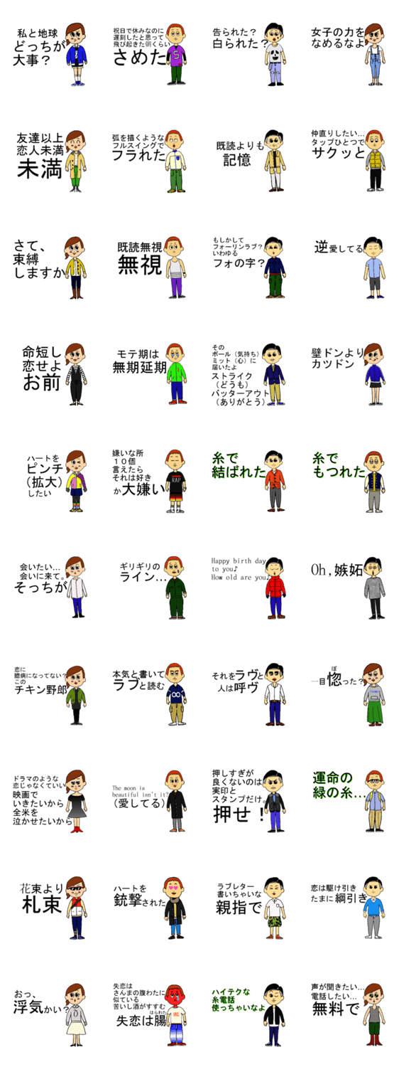 恋愛専用スタンプちょっと毒舌(着せ替え) 3K コメントをどうぞ ラブラブでちょっと面白い、ちょっと笑える、ちょっとかわいい、でもシュールな毒のあるスタンプです。うまく使いこなせばモテモテになるといいなと思ってます。 このスタンプどう思う?!↓クリックで投票♪好き (0)かわいい (0)かっこいい (0)おもしろい (0)使いやすそう (0)欲しい (0)萌え (0)ほっこりする (0)おしゃれ (0)ゆるい (0)こわい (0)ウザい (0)キモい (0)ムカつく (0)持ってる (0)癒される (0)セクシー (0)個性的 (0)私は買わない (0)誰かプレゼントして! (0) 購入・プレゼントする Facebookでシェア Twitterでシェア