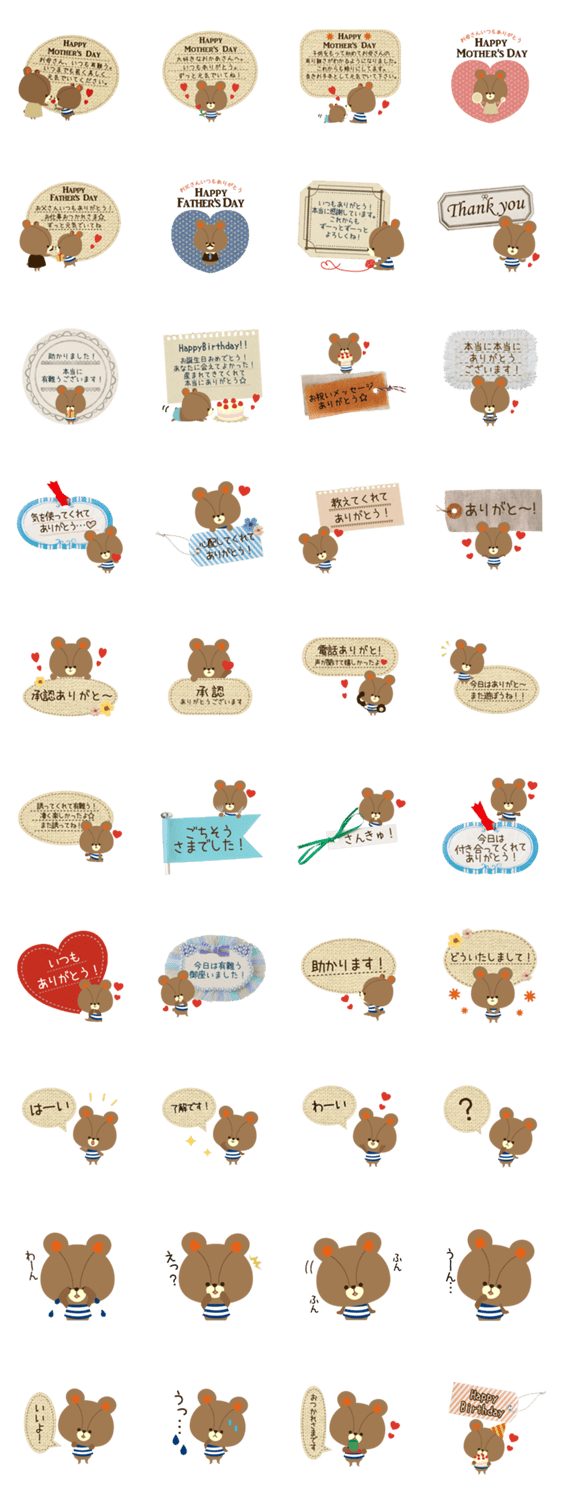感謝の気持ちを伝えるスタンプ JellyFishDesignOffice コメントをどうぞ 絵本テイストの可愛いくまちゃんが、母の日、父の日、家族や友人、上司や先輩など敬語からタメ語までバリエーション豊かに感謝の気持ちを伝えます☆ このスタンプどう思う?!↓クリックで投票♪好き (0)かわいい (0)かっこいい (0)おもしろい (0)使いやすそう (0)欲しい (0)萌え (0)ほっこりする (0)おしゃれ (0)ゆるい (0)こわい (0)ウザい (0)キモい (0)ムカつく (0)持ってる (0)癒される (0)セクシー (0)個性的 (0)私は買わない (0)誰かプレゼントして! (0) 購入・プレゼントする Facebookでシェア Twitterでシェア