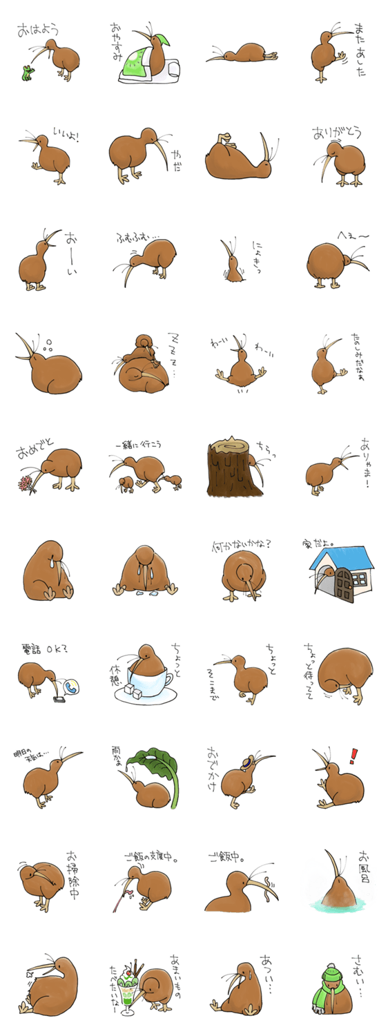 我が名はキウイ ありゃ コメントをどうぞ 羽根のない鳥、キウイの生活が垣間見れるスタンプです。一生懸命生きてます。 このスタンプどう思う?!↓クリックで投票♪好き (0)かわいい (0)かっこいい (0)おもしろい (0)使いやすそう (0)欲しい (0)萌え (0)ほっこりする (0)おしゃれ (0)ゆるい (0)こわい (0)ウザい (0)キモい (0)ムカつく (0)持ってる (0)癒される (0)セクシー (0)個性的 (0)私は買わない (0)誰かプレゼントして! (0) 購入・プレゼントする Facebookでシェア Twitterでシェア