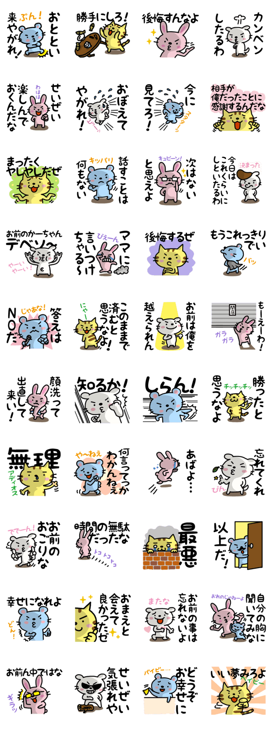 捨てゼリフかよ! Design Room GAKU コメントをどうぞ 犬猫動物達が、かわいい顔して捨て台詞を吐きまくるよ! 夫婦・恋人・友達同士で捨て台詞の応酬を楽しんでね! たまねぎオジさん・ひげづらわんこのDRGから新作登場。 このスタンプどう思う?!↓クリックで投票♪好き (0)かわいい (0)かっこいい (0)おもしろい (0)使いやすそう (0)欲しい (0)萌え (0)ほっこりする (0)おしゃれ (0)ゆるい (0)こわい (0)ウザい (0)キモい (0)ムカつく (0)持ってる (0)癒される (0)セクシー (0)個性的 (0)私は買わない (0)誰かプレゼントして! (0) 購入・プレゼントする Facebookでシェア Twitterでシェア