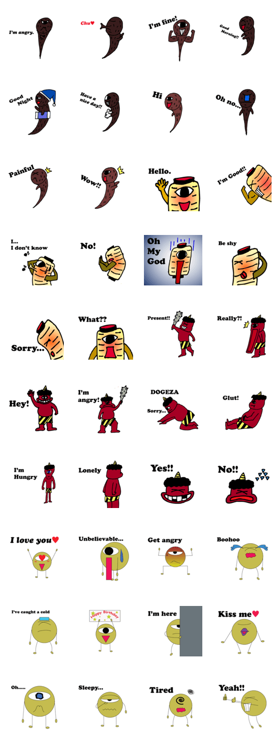 日本の妖怪たち(ひとつ目シリーズ) YUSUKE コメントをどうぞ 日本の妖怪たちのコミカルなスタンプです。 このスタンプどう思う?!↓クリックで投票♪好き (0)かわいい (0)かっこいい (0)おもしろい (0)使いやすそう (0)欲しい (0)萌え (0)ほっこりする (0)おしゃれ (0)ゆるい (0)こわい (0)ウザい (0)キモい (0)ムカつく (0)持ってる (0)癒される (0)セクシー (0)個性的 (0)私は買わない (0)誰かプレゼントして! (0) 購入・プレゼントする Facebookでシェア Twitterでシェア