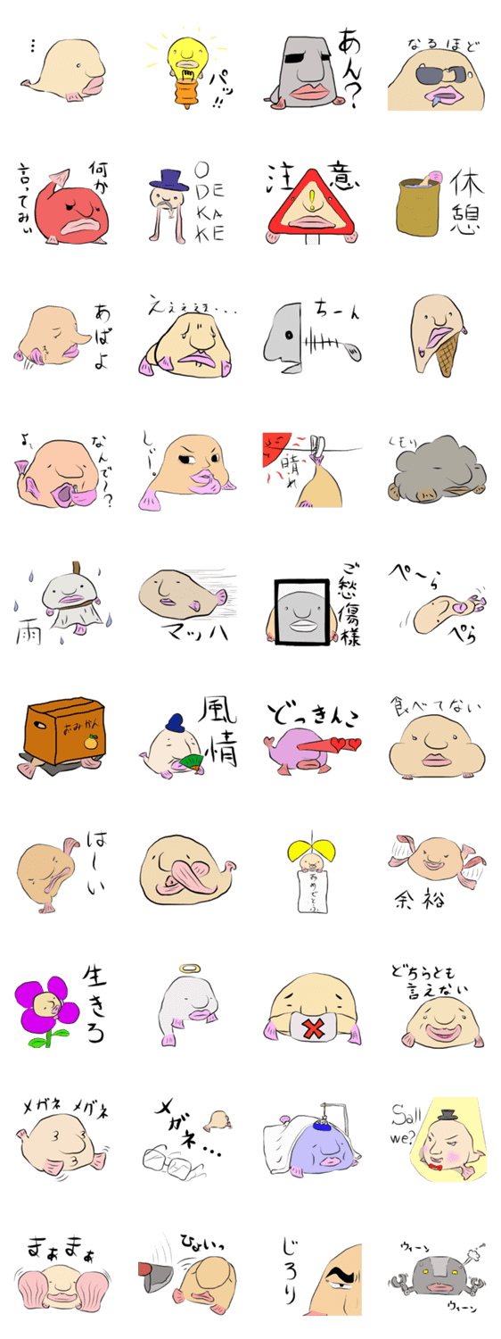 最醜生物!ブロブさん。 KeiYoshida コメントをどうぞ 世界で最も醜い生物こと、ブロブフィッシュ(和名:ニュウドウカジカ)のスタンプです。力の抜けたブロブさんの返事で、相手に程よい苛立ちを与えましょう。 このスタンプどう思う?!↓クリックで投票♪好き (0)かわいい (0)かっこいい (0)おもしろい (0)使いやすそう (0)欲しい (0)萌え (0)ほっこりする (0)おしゃれ (0)ゆるい (0)こわい (0)ウザい (0)キモい (0)ムカつく (0)持ってる (0)癒される (0)セクシー (0)個性的 (0)私は買わない (0)誰かプレゼントして! (0) 購入・プレゼントする Facebookでシェア Twitterでシェア
