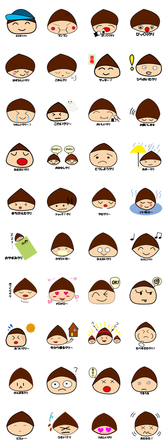 栗の顔スタンプ Kekero コメントをどうぞ 7歳の女の子が考えたクリの日常を描いたスタンプです このスタンプどう思う?!↓クリックで投票♪好き (0)かわいい (0)かっこいい (0)おもしろい (0)使いやすそう (0)欲しい (0)萌え (0)ほっこりする (0)おしゃれ (0)ゆるい (0)こわい (0)ウザい (0)キモい (0)ムカつく (0)持ってる (0)癒される (0)セクシー (0)個性的 (0)私は買わない (0)誰かプレゼントして! (0) 購入・プレゼントする Facebookでシェア Twitterでシェア