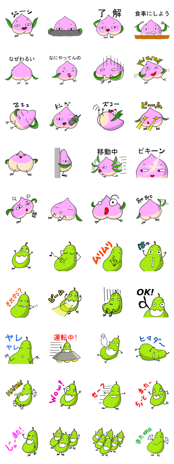 桃星人と洋梨星人 TAKA720 コメントをどうぞ 未知の生命体、桃星人と洋梨星人のスタンプです。 このスタンプどう思う?!↓クリックで投票♪好き (0)かわいい (0)かっこいい (0)おもしろい (0)使いやすそう (0)欲しい (0)萌え (0)ほっこりする (0)おしゃれ (0)ゆるい (0)こわい (0)ウザい (0)キモい (0)ムカつく (0)持ってる (0)癒される (0)セクシー (0)個性的 (0)私は買わない (0)誰かプレゼントして! (0) 購入・プレゼントする Facebookでシェア Twitterでシェア