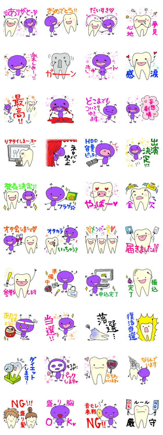 歯くんとムシバイキン アイドル編 おうまる コメントをどうぞ 歯くんだって、ムシバイキンだって、アイドルが好き!ライブ、コンサート、日常で、大好きなアイドルを応援する2人をお楽しみ下さい。 このスタンプどう思う?!↓クリックで投票♪好き (0)かわいい (0)かっこいい (0)おもしろい (0)使いやすそう (0)欲しい (0)萌え (0)ほっこりする (0)おしゃれ (0)ゆるい (0)こわい (0)ウザい (0)キモい (0)ムカつく (0)持ってる (0)癒される (0)セクシー (0)個性的 (0)私は買わない (0)誰かプレゼントして! (0) 購入・プレゼントする Facebookでシェア Twitterでシェア