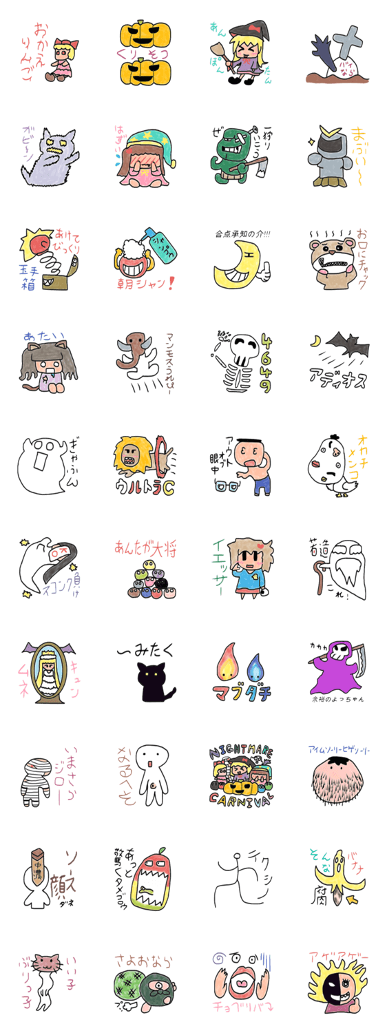 死語を今一度流行らすナイトメアカーニバル tarakyo コメントをどうぞ 魔女やフランケンたちが、「あんぽんたん」や「ぎゃふん」、「まぶい」、「チョベリバ」などの死語を蘇らせ再び流行らせるために、ナイトメアカーニバルを開催しています! このスタンプどう思う?!↓クリックで投票♪好き (0)かわいい (0)かっこいい (0)おもしろい (0)使いやすそう (0)欲しい (0)萌え (0)ほっこりする (0)おしゃれ (0)ゆるい (0)こわい (0)ウザい (0)キモい (0)ムカつく (0)持ってる (0)癒される (0)セクシー (0)個性的 (0)私は買わない (0)誰かプレゼントして! (0) 購入・プレゼントする Facebookでシェア Twitterでシェア