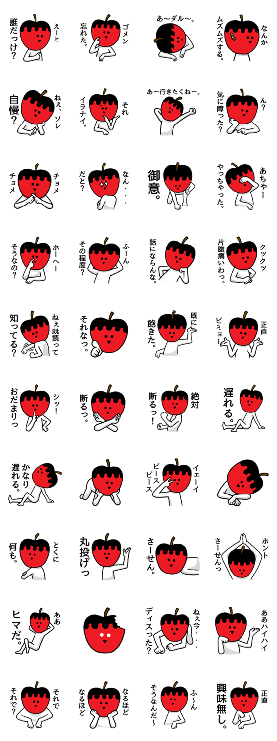 毒リンゴさん 井上 理視 コメントをどうぞ 毒リンゴさんは毒舌リンゴ。イラつく事を言うけど本人に自覚はありません。 このスタンプどう思う?!↓クリックで投票♪好き (0)かわいい (0)かっこいい (0)おもしろい (0)使いやすそう (0)欲しい (0)萌え (0)ほっこりする (0)おしゃれ (0)ゆるい (0)こわい (0)ウザい (0)キモい (0)ムカつく (0)持ってる (0)癒される (0)セクシー (0)個性的 (0)私は買わない (0)誰かプレゼントして! (0) 購入・プレゼントする Facebookでシェア Twitterでシェア