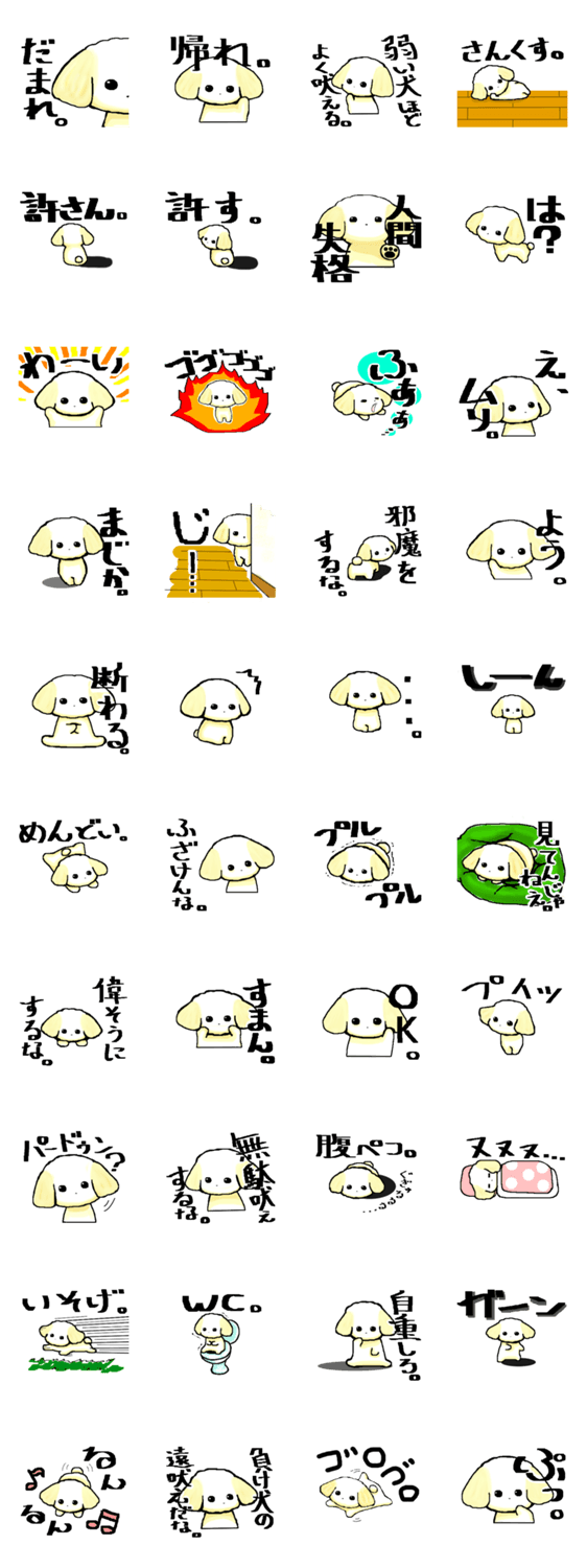 毒舌わんこ。 ちっぷ コメントをどうぞ 愛らしい見た目とは裏腹に、発する言葉は辛辣です。どんなに毒を吐いても可愛いから許されます。たぶん。 このスタンプどう思う?!↓クリックで投票♪好き (0)かわいい (0)かっこいい (0)おもしろい (0)使いやすそう (0)欲しい (0)萌え (0)ほっこりする (0)おしゃれ (0)ゆるい (0)こわい (0)ウザい (0)キモい (0)ムカつく (0)持ってる (0)癒される (0)セクシー (0)個性的 (0)私は買わない (0)誰かプレゼントして! (0) 購入・プレゼントする Facebookでシェア Twitterでシェア