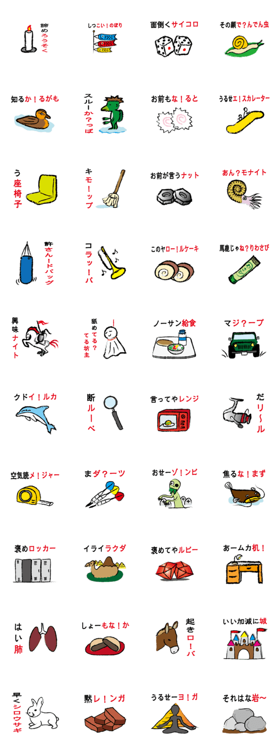 毒舌ダジャレ(筆絵風) ケイまる コメントをどうぞ ちょっとマイナーな物達で毒舌だじゃれをお楽しみください。イラストは筆絵風で少しレトロです。 このスタンプどう思う?!↓クリックで投票♪好き (0)かわいい (0)かっこいい (0)おもしろい (0)使いやすそう (0)欲しい (0)萌え (0)ほっこりする (0)おしゃれ (0)ゆるい (0)こわい (0)ウザい (0)キモい (0)ムカつく (0)持ってる (0)癒される (0)セクシー (0)個性的 (0)私は買わない (0)誰かプレゼントして! (0) 購入・プレゼントする Facebookでシェア Twitterでシェア