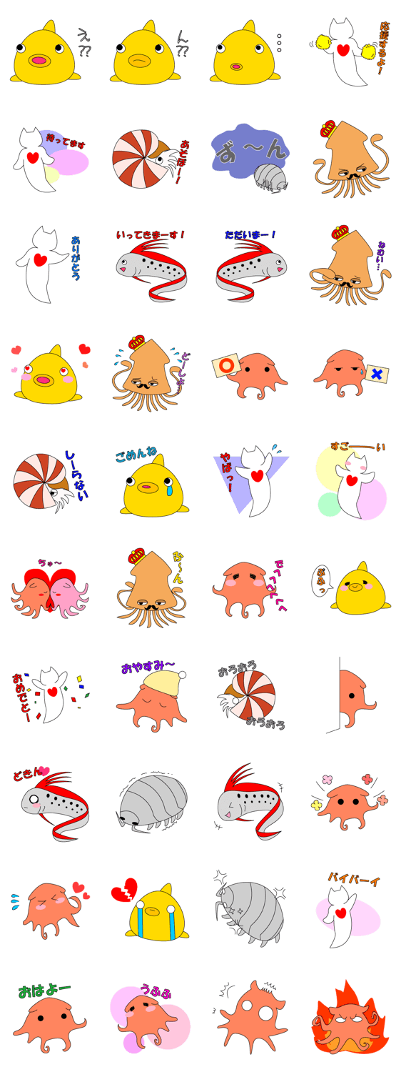 深海魚たち もも コメントをどうぞ ダイオウイカ、クリオネ、オウムガイ、リュウグウノツカイ、オオグソクムシ、フウセンウオ、メンダコをスタンプにしました。 このスタンプどう思う?!↓クリックで投票♪好き (0)かわいい (0)かっこいい (0)おもしろい (0)使いやすそう (0)欲しい (0)萌え (0)ほっこりする (0)おしゃれ (0)ゆるい (0)こわい (0)ウザい (0)キモい (0)ムカつく (0)持ってる (0)癒される (0)セクシー (0)個性的 (0)私は買わない (0)誰かプレゼントして! (0) 購入・プレゼントする Facebookでシェア Twitterでシェア