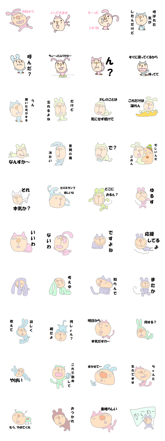 猫の様な、うさぎの様な、やつ H.tomomo コメントをどうぞ 猫の様な、うさぎの様な、やる気無いキモカワ達です。あなたなら使いこなせるはず。 このスタンプどう思う?!↓クリックで投票♪好き (0)かわいい (0)かっこいい (0)おもしろい (0)使いやすそう (0)欲しい (0)萌え (0)ほっこりする (0)おしゃれ (0)ゆるい (0)こわい (0)ウザい (0)キモい (0)ムカつく (0)持ってる (0)癒される (0)セクシー (0)個性的 (0)私は買わない (0)誰かプレゼントして! (0) 購入・プレゼントする Facebookでシェア Twitterでシェア