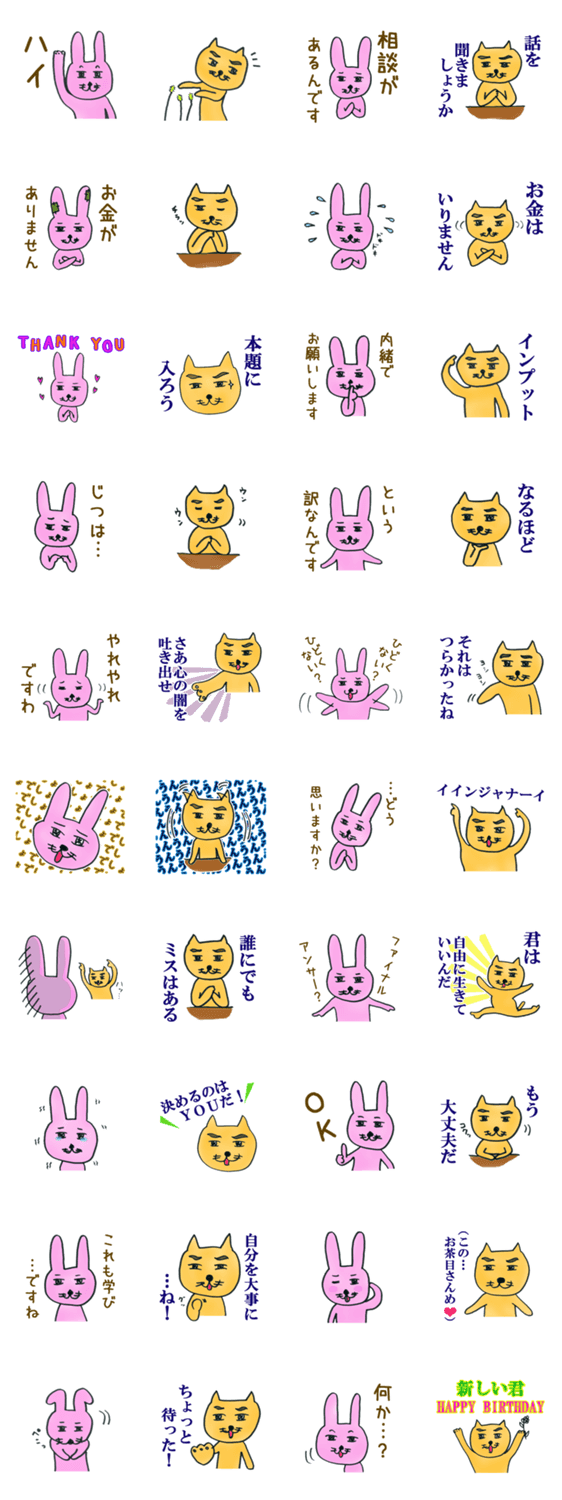猫カウンセラーはこちらです よーじゅ+ コメントをどうぞ 聞き上手なネコ先生によるカウンセリングの様子をお届けします。お悩みに、あいづち&アドバイス&心に響くメッセージ。相談する人も、される人も使えるスタンプです。 このスタンプどう思う?!↓クリックで投票♪好き (0)かわいい (0)かっこいい (0)おもしろい (0)使いやすそう (0)欲しい (0)萌え (0)ほっこりする (0)おしゃれ (0)ゆるい (0)こわい (0)ウザい (0)キモい (0)ムカつく (0)持ってる (0)癒される (0)セクシー (0)個性的 (0)私は買わない (0)誰かプレゼントして! (0) 購入・プレゼントする Facebookでシェア Twitterでシェア
