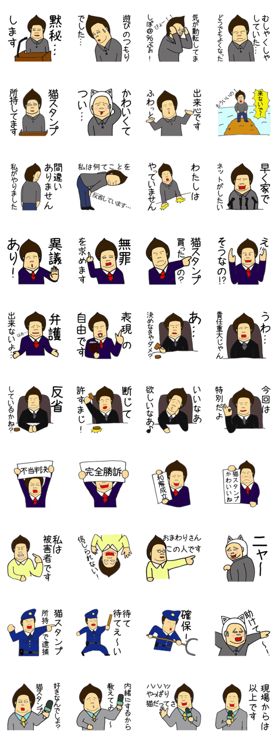 猫スタンプ禁止を巡る裁判☆栗林君Vol.2 焼きえぼ鯛 コメントをどうぞ 猫スタンプ禁止の架空世界の裁判劇!ネコスタンプ所持容疑の被告人や弁護士、裁判官、警察等に扮する栗林君。こんなスタンプほっといて可愛い猫スタンプを買いに行こう! このスタンプどう思う?!↓クリックで投票♪好き (0)かわいい (0)かっこいい (0)おもしろい (0)使いやすそう (0)欲しい (0)萌え (0)ほっこりする (0)おしゃれ (0)ゆるい (0)こわい (0)ウザい (0)キモい (0)ムカつく (0)持ってる (0)癒される (0)セクシー (0)個性的 (0)私は買わない (0)誰かプレゼントして! (0) 購入・プレゼントする Facebookでシェア Twitterでシェア