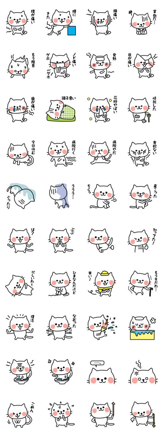 病弱なネコさん。病気でつらい白猫です ahiruyokocho コメントをどうぞ ねこシリーズ。頭やお腹が痛かったり、怪我したり花粉症だったり、いつもつらそう。便秘に悩んだり鬱で調子を崩したり。学校や会社を休む時に友だちや家族に送ってね。 このスタンプどう思う?!↓クリックで投票♪好き (0)かわいい (0)かっこいい (0)おもしろい (0)使いやすそう (0)欲しい (0)萌え (0)ほっこりする (0)おしゃれ (0)ゆるい (0)こわい (0)ウザい (0)キモい (0)ムカつく (0)持ってる (0)癒される (0)セクシー (0)個性的 (0)私は買わない (0)誰かプレゼントして! (0) 購入・プレゼントする Facebookでシェア Twitterでシェア