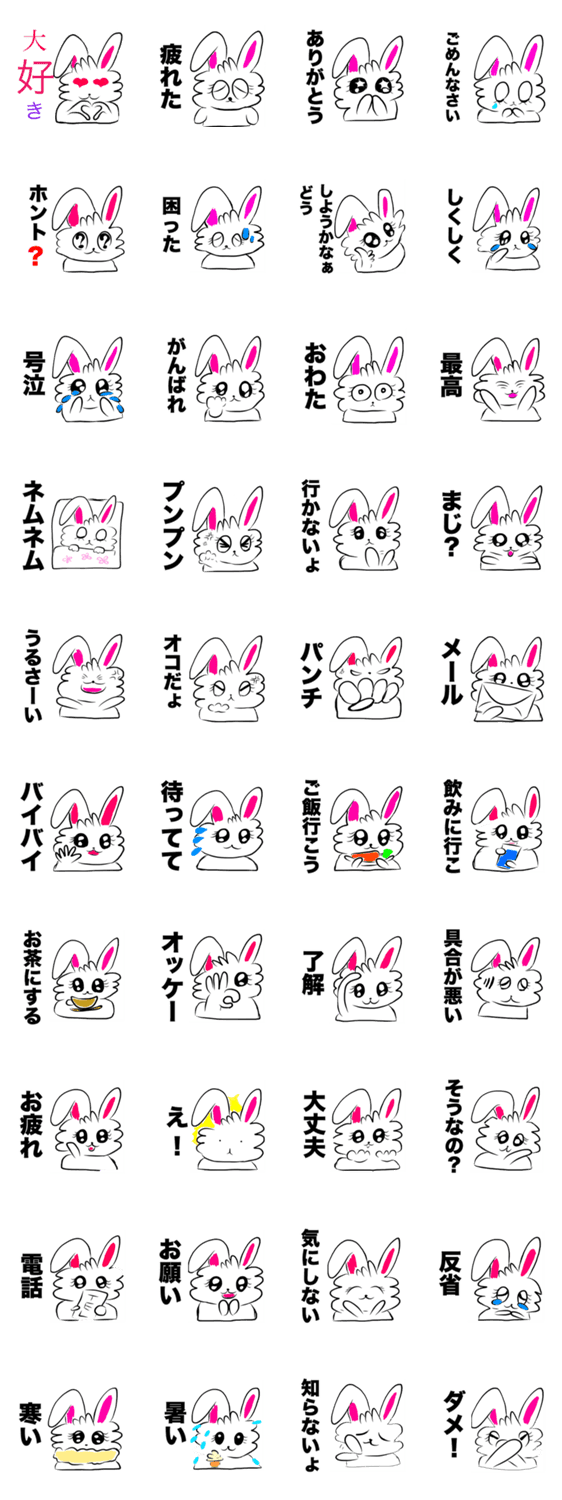 白いウサギちゃんスタンプ、ミミ〜ちゃん 千鶴 コメントをどうぞ 白いウサギちゃんのミミ〜です。楽しくて便利なスタンプを作りました。登録キーワード大好き,お願い,オッケー,御飯行こう,飲みに行きたい,了解,大丈夫,メール下さいなど このスタンプどう思う?!↓クリックで投票♪好き (0)かわいい (0)かっこいい (0)おもしろい (0)使いやすそう (0)欲しい (0)萌え (0)ほっこりする (0)おしゃれ (0)ゆるい (0)こわい (0)ウザい (0)キモい (0)ムカつく (0)持ってる (0)癒される (0)セクシー (0)個性的 (0)私は買わない (0)誰かプレゼントして! (0) 購入・プレゼントする Facebookでシェア Twitterでシェア