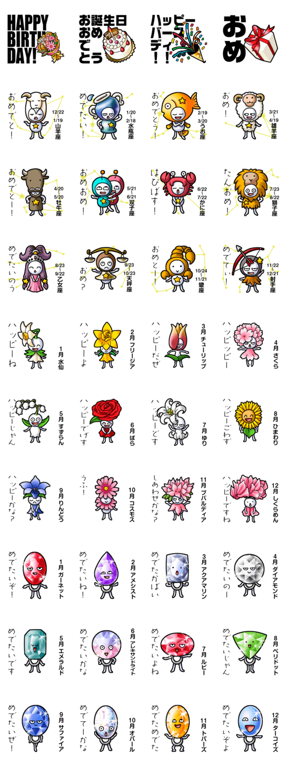 祝キャラ 誕生石・誕生花・星座シリーズ feik_D コメントをどうぞ その名の通り!お祝いキャラクターです。誕生石や誕生花、星座など誕生日に添えて使用出来るスタンプです! このスタンプどう思う?!↓クリックで投票♪好き (0)かわいい (0)かっこいい (0)おもしろい (0)使いやすそう (0)欲しい (0)萌え (0)ほっこりする (0)おしゃれ (0)ゆるい (0)こわい (0)ウザい (0)キモい (0)ムカつく (0)持ってる (0)癒される (0)セクシー (0)個性的 (0)私は買わない (0)誰かプレゼントして! (0) 購入・プレゼントする Facebookでシェア Twitterでシェア