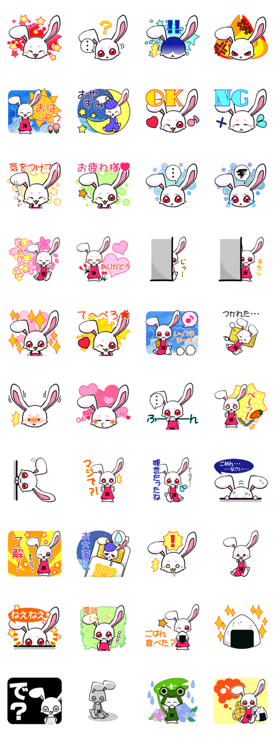 米屋の看板うさぎ こめうさ にゃほるー コメントをどうぞ ニンジンよりお米が大好きな白いうさぎのおんなのこ♪右のタレ耳と大きな瞳がチャームポイントの商店街のアイドル★素直な気持ちを伝えるゆるいウサギのスタンプです! このスタンプどう思う?!↓クリックで投票♪好き (0)かわいい (0)かっこいい (0)おもしろい (0)使いやすそう (0)欲しい (0)萌え (0)ほっこりする (0)おしゃれ (0)ゆるい (0)こわい (0)ウザい (0)キモい (0)ムカつく (0)持ってる (0)癒される (0)セクシー (0)個性的 (0)私は買わない (0)誰かプレゼントして! (0) 購入・プレゼントする Facebookでシェア Twitterでシェア