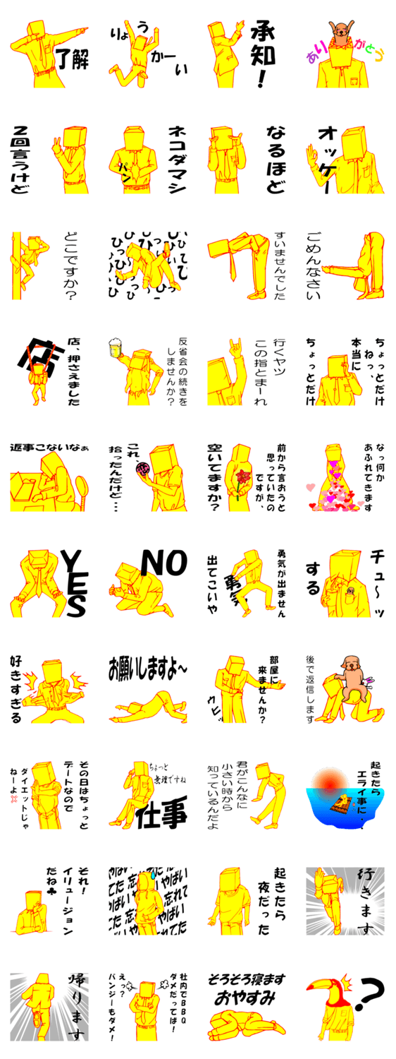 紙袋サラリーマン 第三弾 kurouuron コメントをどうぞ 紙袋を被ったサラリーマン。ゆるーいすたんぷです。 このスタンプどう思う?!↓クリックで投票♪好き (0)かわいい (0)かっこいい (0)おもしろい (0)使いやすそう (0)欲しい (0)萌え (0)ほっこりする (0)おしゃれ (0)ゆるい (0)こわい (0)ウザい (0)キモい (0)ムカつく (0)持ってる (0)癒される (0)セクシー (0)個性的 (0)私は買わない (0)誰かプレゼントして! (0) 購入・プレゼントする Facebookでシェア Twitterでシェア