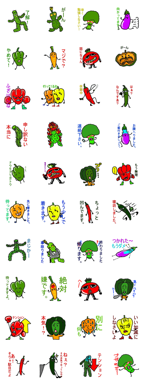 緑の連中 Da-yoshi コメントをどうぞ 緑の連中です。サボテンや緑黄色野菜など色々います。 このスタンプどう思う?!↓クリックで投票♪好き (0)かわいい (0)かっこいい (0)おもしろい (0)使いやすそう (0)欲しい (0)萌え (0)ほっこりする (0)おしゃれ (0)ゆるい (0)こわい (0)ウザい (0)キモい (0)ムカつく (0)持ってる (0)癒される (0)セクシー (0)個性的 (0)私は買わない (0)誰かプレゼントして! (0) 購入・プレゼントする Facebookでシェア Twitterでシェア