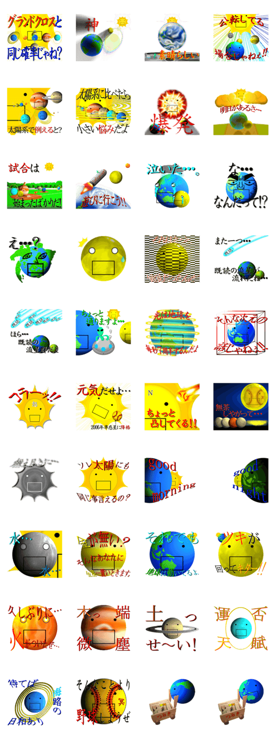 能天気。太陽系! donben コメントをどうぞ 送る方も送られる方も少しだけ元気になれるスタンプ。 このスタンプどう思う?!↓クリックで投票♪好き (0)かわいい (0)かっこいい (0)おもしろい (0)使いやすそう (0)欲しい (0)萌え (0)ほっこりする (0)おしゃれ (0)ゆるい (0)こわい (0)ウザい (0)キモい (0)ムカつく (0)持ってる (0)癒される (0)セクシー (0)個性的 (0)私は買わない (0)誰かプレゼントして! (0) 購入・プレゼントする Facebookでシェア Twitterでシェア