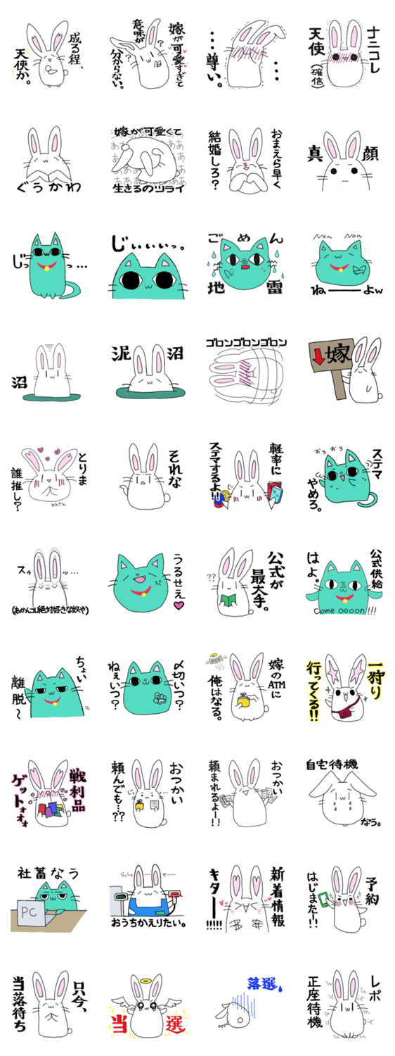 腐沙美ちゃんと音虎太くん HGN コメントをどうぞ 腐女子でドルオタなウサギの腐沙美ちゃん、時々、ちょっと辛口毒舌オタクにゃんこの音虎太くんの、ささやかなオタ日常スタンプです。 このスタンプどう思う?!↓クリックで投票♪好き (0)かわいい (0)かっこいい (0)おもしろい (0)使いやすそう (0)欲しい (0)萌え (0)ほっこりする (0)おしゃれ (0)ゆるい (0)こわい (0)ウザい (0)キモい (0)ムカつく (0)持ってる (0)癒される (0)セクシー (0)個性的 (0)私は買わない (0)誰かプレゼントして! (0) 購入・プレゼントする Facebookでシェア Twitterでシェア