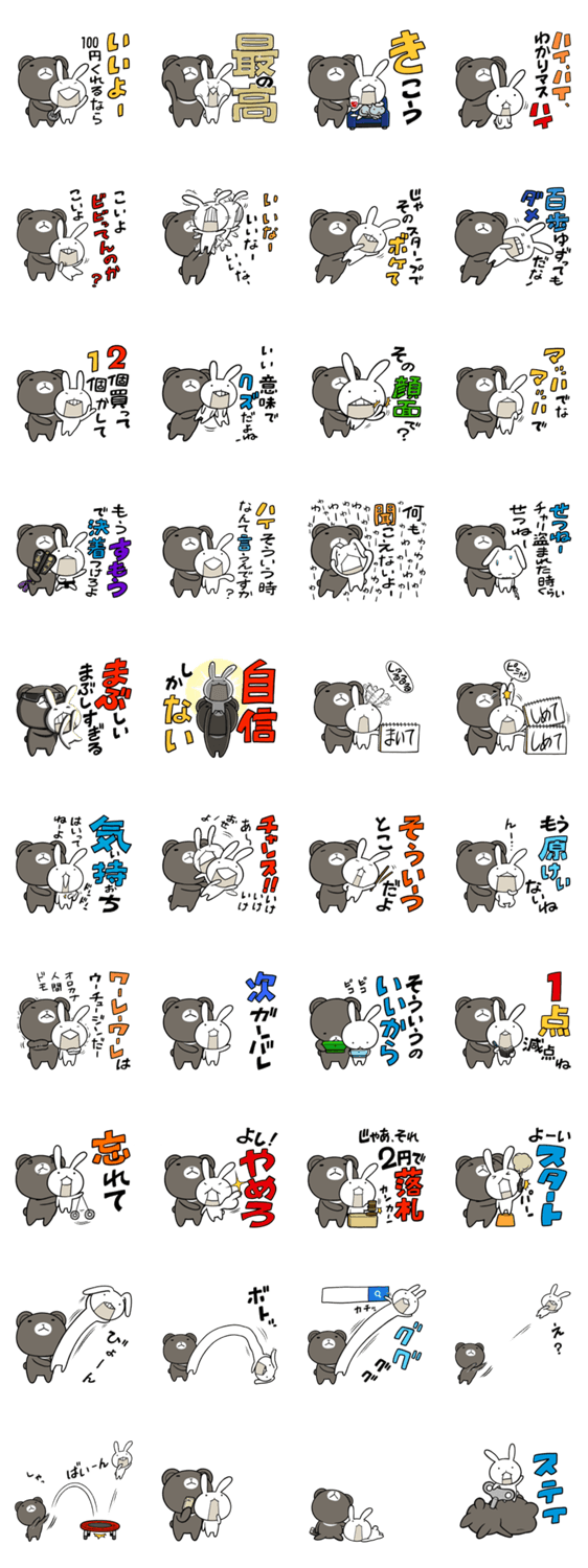 腹話術うさぎ マモる コメントをどうぞ クマが自由奔放なうさぎ人形(?)の腹話術で言いにくいゲスいことも言っちゃうスタンプです。 このスタンプどう思う?!↓クリックで投票♪好き (0)かわいい (0)かっこいい (0)おもしろい (0)使いやすそう (0)欲しい (0)萌え (0)ほっこりする (0)おしゃれ (0)ゆるい (0)こわい (0)ウザい (0)キモい (0)ムカつく (0)持ってる (0)癒される (0)セクシー (0)個性的 (0)私は買わない (0)誰かプレゼントして! (0) 購入・プレゼントする Facebookでシェア Twitterでシェア