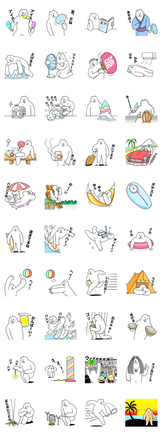 自由に生きるクマ〜夏〜 あーだん コメントをどうぞ 自由に生きてるクマのスタンプ夏バージョンです。夏の過ごし方が盛りだくさん!山へ行ったり、海へ行ったり、花火したり。 このスタンプどう思う?!↓クリックで投票♪好き (0)かわいい (0)かっこいい (0)おもしろい (0)使いやすそう (0)欲しい (0)萌え (0)ほっこりする (0)おしゃれ (0)ゆるい (0)こわい (0)ウザい (0)キモい (0)ムカつく (0)持ってる (0)癒される (0)セクシー (0)個性的 (0)私は買わない (0)誰かプレゼントして! (0) 購入・プレゼントする Facebookでシェア Twitterでシェア