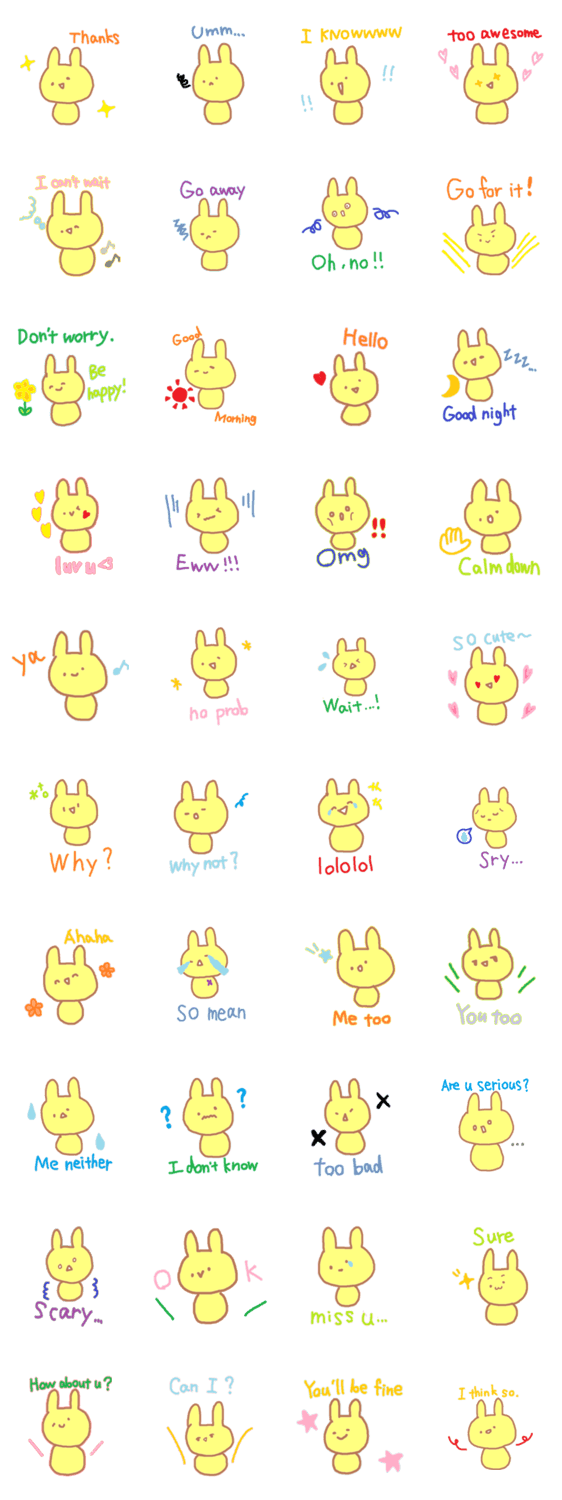 英語を話せる帰国子女うさぎ もえ大福 コメントをどうぞ 一見、日本のかわいい文化を代表するうさぎのキャラクターのようだけど、実は英語がペラペラ。外国でよく使われているフレーズを、ネイティブに言ってくれるよ。 このスタンプどう思う?!↓クリックで投票♪好き (0)かわいい (0)かっこいい (0)おもしろい (0)使いやすそう (0)欲しい (0)萌え (0)ほっこりする (0)おしゃれ (0)ゆるい (0)こわい (0)ウザい (0)キモい (0)ムカつく (0)持ってる (0)癒される (0)セクシー (0)個性的 (0)私は買わない (0)誰かプレゼントして! (0) 購入・プレゼントする Facebookでシェア Twitterでシェア