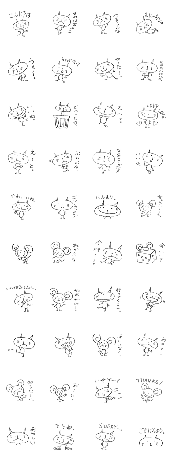 落書きされたネコとネズミ ROGAN コメントをどうぞ ちょっと幼稚に描かれた落書き風のネコとネズミ。ついでに下手な手書き文字も加えておきまいした。使い方しだいで会話を和やかにしてくれるのでは・・・? このスタンプどう思う?!↓クリックで投票♪好き (0)かわいい (0)かっこいい (0)おもしろい (0)使いやすそう (0)欲しい (0)萌え (0)ほっこりする (0)おしゃれ (0)ゆるい (0)こわい (0)ウザい (0)キモい (0)ムカつく (0)持ってる (0)癒される (0)セクシー (0)個性的 (0)私は買わない (0)誰かプレゼントして! (0) 購入・プレゼントする Facebookでシェア Twitterでシェア