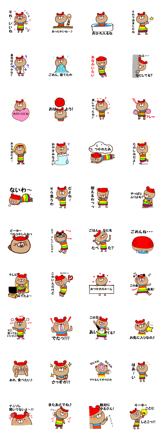 虹色クマの日常会話☆ ここち コメントをどうぞ 虹色の服を着たクマ。よく使う日常会話をスタンプに♪虹色の何色か足りないの。そこは、あなた色に会話を染めてください♪ゆるーく、かわいく、会話のお手伝い♪ このスタンプどう思う?!↓クリックで投票♪好き (0)かわいい (0)かっこいい (0)おもしろい (0)使いやすそう (0)欲しい (0)萌え (0)ほっこりする (0)おしゃれ (0)ゆるい (0)こわい (0)ウザい (0)キモい (0)ムカつく (0)持ってる (0)癒される (0)セクシー (0)個性的 (0)私は買わない (0)誰かプレゼントして! (0) 購入・プレゼントする Facebookでシェア Twitterでシェア