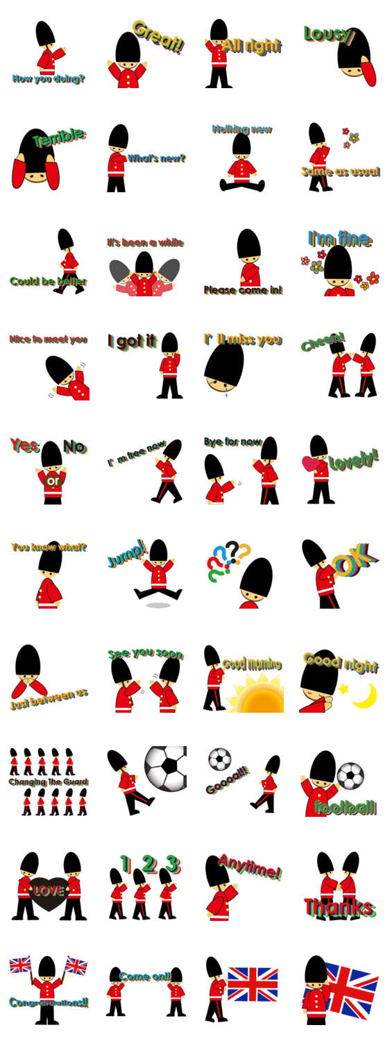 衛兵ちゃん 英語バージョン コチニージョ コメントをどうぞ ロンドン衛兵のスタンプ第3弾。英語バージョン。ユニオンジャックやサッカーなどイギリス色満載のスタンプ。カラフル文字で元気なスタンプ。 このスタンプどう思う?!↓クリックで投票♪好き (0)かわいい (0)かっこいい (0)おもしろい (0)使いやすそう (0)欲しい (0)萌え (0)ほっこりする (0)おしゃれ (0)ゆるい (0)こわい (0)ウザい (0)キモい (0)ムカつく (0)持ってる (0)癒される (0)セクシー (0)個性的 (0)私は買わない (0)誰かプレゼントして! (0) 購入・プレゼントする Facebookでシェア Twitterでシェア