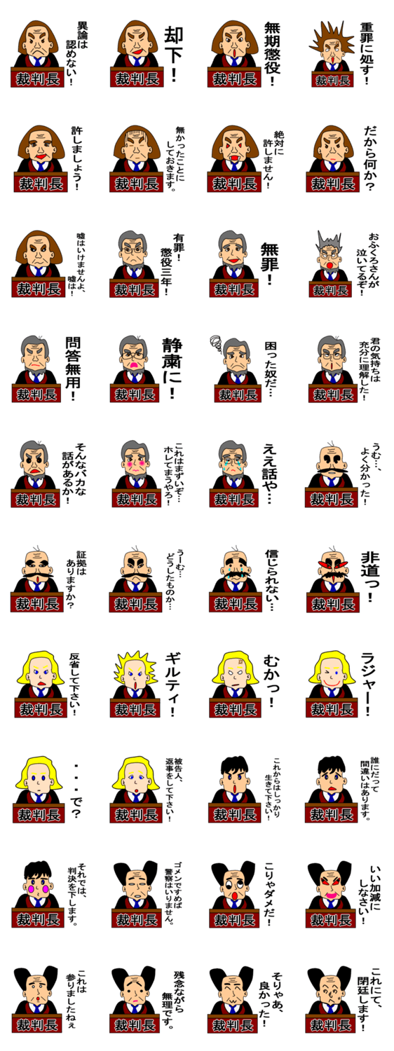 裁判長からの一言 Kikuwa-Sogocon コメントをどうぞ 表情豊かな裁判長たちのコミカルなスタンプです! このスタンプどう思う?!↓クリックで投票♪好き (0)かわいい (0)かっこいい (0)おもしろい (0)使いやすそう (0)欲しい (0)萌え (0)ほっこりする (0)おしゃれ (0)ゆるい (0)こわい (0)ウザい (0)キモい (0)ムカつく (0)持ってる (0)癒される (0)セクシー (0)個性的 (0)私は買わない (0)誰かプレゼントして! (0) 購入・プレゼントする Facebookでシェア Twitterでシェア