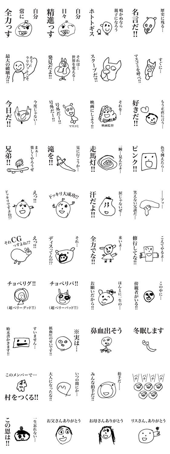 親子グルーヴ P-hama コメントをどうぞ 5歳のuta-P(絵)とP-hama(リリック)による作品「親子グルーヴ」です。 このスタンプどう思う?!↓クリックで投票♪好き (0)かわいい (0)かっこいい (0)おもしろい (0)使いやすそう (0)欲しい (0)萌え (0)ほっこりする (0)おしゃれ (0)ゆるい (0)こわい (0)ウザい (0)キモい (0)ムカつく (0)持ってる (0)癒される (0)セクシー (0)個性的 (0)私は買わない (0)誰かプレゼントして! (0) 購入・プレゼントする Facebookでシェア Twitterでシェア