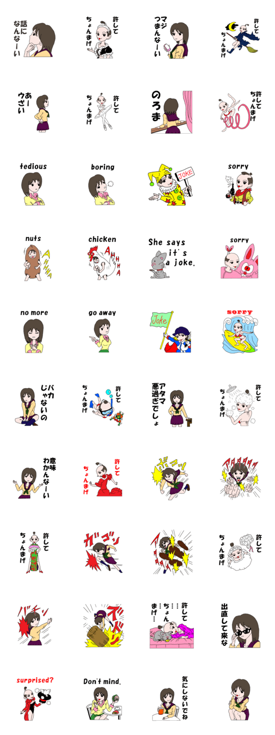 許してちょんまげ子 Arima Million. コメントをどうぞ 彼女は口は悪いし、乱暴だけど、すぐに謝りますから、許してあげてね。 このスタンプどう思う?!↓クリックで投票♪好き (0)かわいい (0)かっこいい (0)おもしろい (0)使いやすそう (0)欲しい (0)萌え (0)ほっこりする (0)おしゃれ (0)ゆるい (0)こわい (0)ウザい (0)キモい (0)ムカつく (0)持ってる (0)癒される (0)セクシー (0)個性的 (0)私は買わない (0)誰かプレゼントして! (0) 購入・プレゼントする Facebookでシェア Twitterでシェア