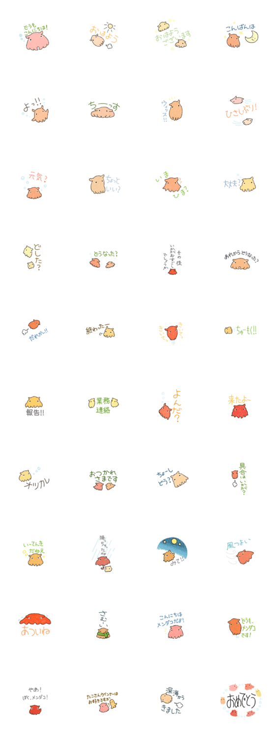 話のきっかけ用メンダコ よく転ぶ コメントをどうぞ 挨拶や呼びかけや天気の話で、深海からやってきたメンダコくんが会話の糸口をさぐります。タコさんウインナーに見えたなら、そのつもりで使ってくださってもかまいません。 このスタンプどう思う?!↓クリックで投票♪好き (0)かわいい (0)かっこいい (0)おもしろい (0)使いやすそう (0)欲しい (0)萌え (0)ほっこりする (0)おしゃれ (0)ゆるい (0)こわい (0)ウザい (0)キモい (0)ムカつく (0)持ってる (0)癒される (0)セクシー (0)個性的 (0)私は買わない (0)誰かプレゼントして! (0) 購入・プレゼントする Facebookでシェア Twitterでシェア