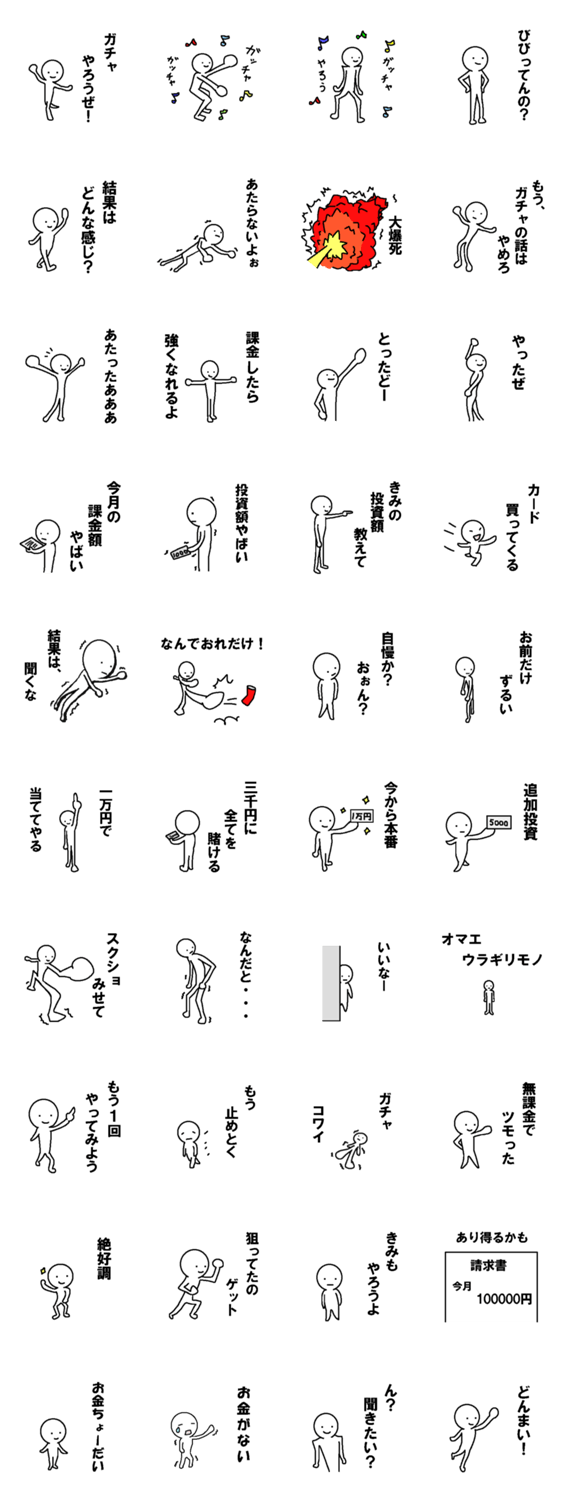 課金ガチャの話題で便利そうなスタンプ おわおわさん コメントをどうぞ 課金ガチャに関係する会話の中で、使いやすそうなスタンプを描いてみました。身内同士で楽しんだり、ネトゲ仲間やめんどくさい友人達と楽しんでください。 このスタンプどう思う?!↓クリックで投票♪好き (0)かわいい (0)かっこいい (0)おもしろい (0)使いやすそう (0)欲しい (0)萌え (0)ほっこりする (0)おしゃれ (0)ゆるい (0)こわい (0)ウザい (0)キモい (0)ムカつく (0)持ってる (0)癒される (0)セクシー (0)個性的 (0)私は買わない (0)誰かプレゼントして! (0) 購入・プレゼントする Facebookでシェア Twitterでシェア