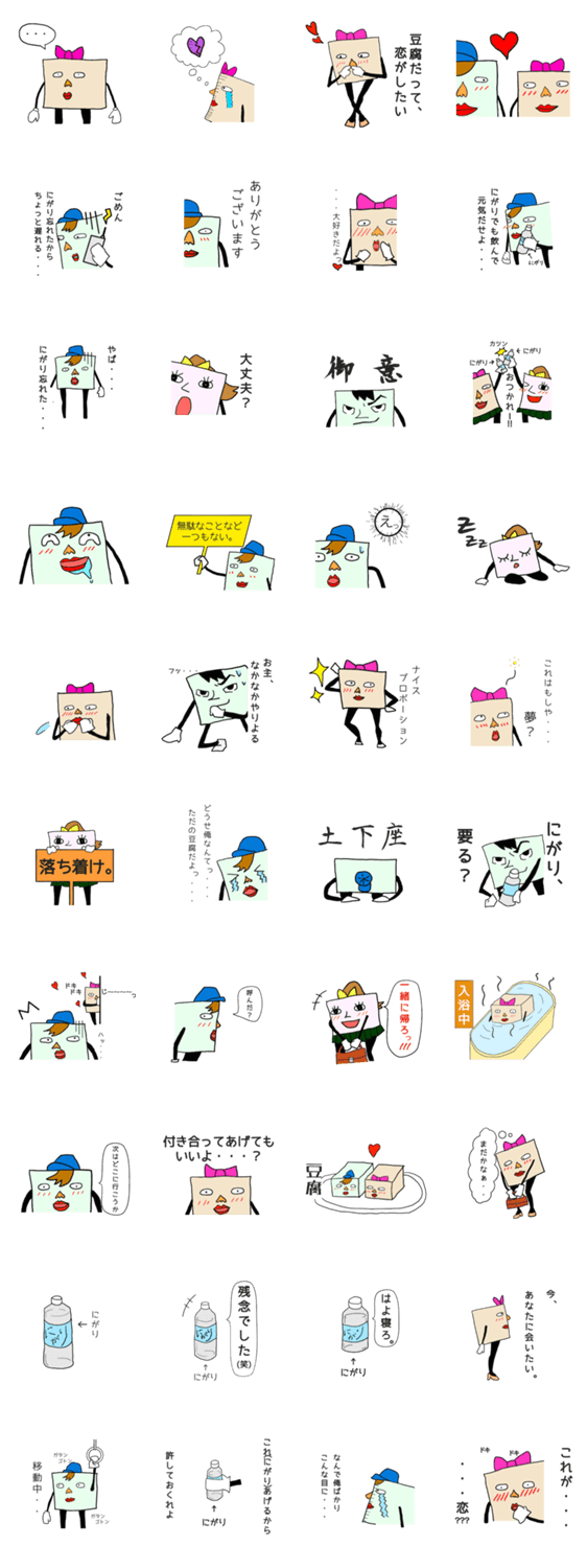 豆腐ラブストーリー TMCプロジェクト コメントをどうぞ 甘く切ない豆腐ラブストーリーのスタンプです このスタンプどう思う?!↓クリックで投票♪好き (0)かわいい (0)かっこいい (0)おもしろい (0)使いやすそう (0)欲しい (0)萌え (0)ほっこりする (0)おしゃれ (0)ゆるい (0)こわい (0)ウザい (0)キモい (0)ムカつく (0)持ってる (0)癒される (0)セクシー (0)個性的 (0)私は買わない (0)誰かプレゼントして! (0) 購入・プレゼントする Facebookでシェア Twitterでシェア
