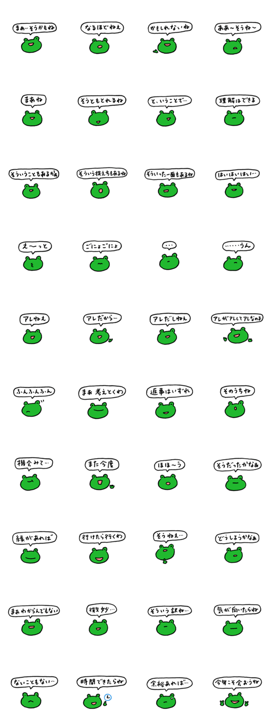 返事を濁すスタンプキャラ「かえるさん」 やまはじめ コメントをどうぞ 超ゆるゆるかえるさんの返事を濁すスタンプです。あんまりはっきり答えたくないなぁというときのその場しのぎの返事に最適です。 このスタンプどう思う?!↓クリックで投票♪好き (0)かわいい (0)かっこいい (0)おもしろい (0)使いやすそう (0)欲しい (0)萌え (0)ほっこりする (0)おしゃれ (0)ゆるい (0)こわい (0)ウザい (0)キモい (0)ムカつく (0)持ってる (0)癒される (0)セクシー (0)個性的 (0)私は買わない (0)誰かプレゼントして! (0) 購入・プレゼントする Facebookでシェア Twitterでシェア