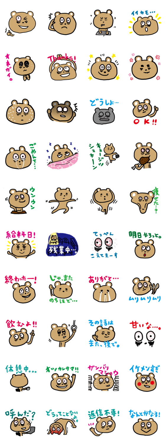 過労気味のクマクマ kao コメントをどうぞ 仕事一筋のクマクマ。残業や休出にもめげず、今日もカタカタお仕事。充血した目とその下のクマがデフォルトであり、チャームポイント。 このスタンプどう思う?!↓クリックで投票♪好き (0)かわいい (0)かっこいい (0)おもしろい (0)使いやすそう (0)欲しい (0)萌え (0)ほっこりする (0)おしゃれ (0)ゆるい (0)こわい (0)ウザい (0)キモい (0)ムカつく (0)持ってる (0)癒される (0)セクシー (0)個性的 (0)私は買わない (0)誰かプレゼントして! (0) 購入・プレゼントする Facebookでシェア Twitterでシェア