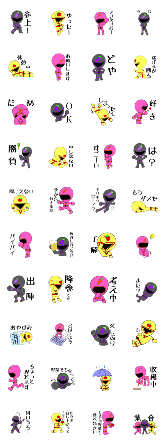 野菜戦隊ベジタマン Luck River コメントをどうぞ メンバーは「なすびブラック」「にんじんピンク」「とまとイエロー」の3人。野菜の平和を守るヒーローです。 このスタンプどう思う?!↓クリックで投票♪好き (0)かわいい (0)かっこいい (0)おもしろい (0)使いやすそう (0)欲しい (0)萌え (0)ほっこりする (0)おしゃれ (0)ゆるい (0)こわい (0)ウザい (0)キモい (0)ムカつく (0)持ってる (0)癒される (0)セクシー (0)個性的 (0)私は買わない (0)誰かプレゼントして! (0) 購入・プレゼントする Facebookでシェア Twitterでシェア