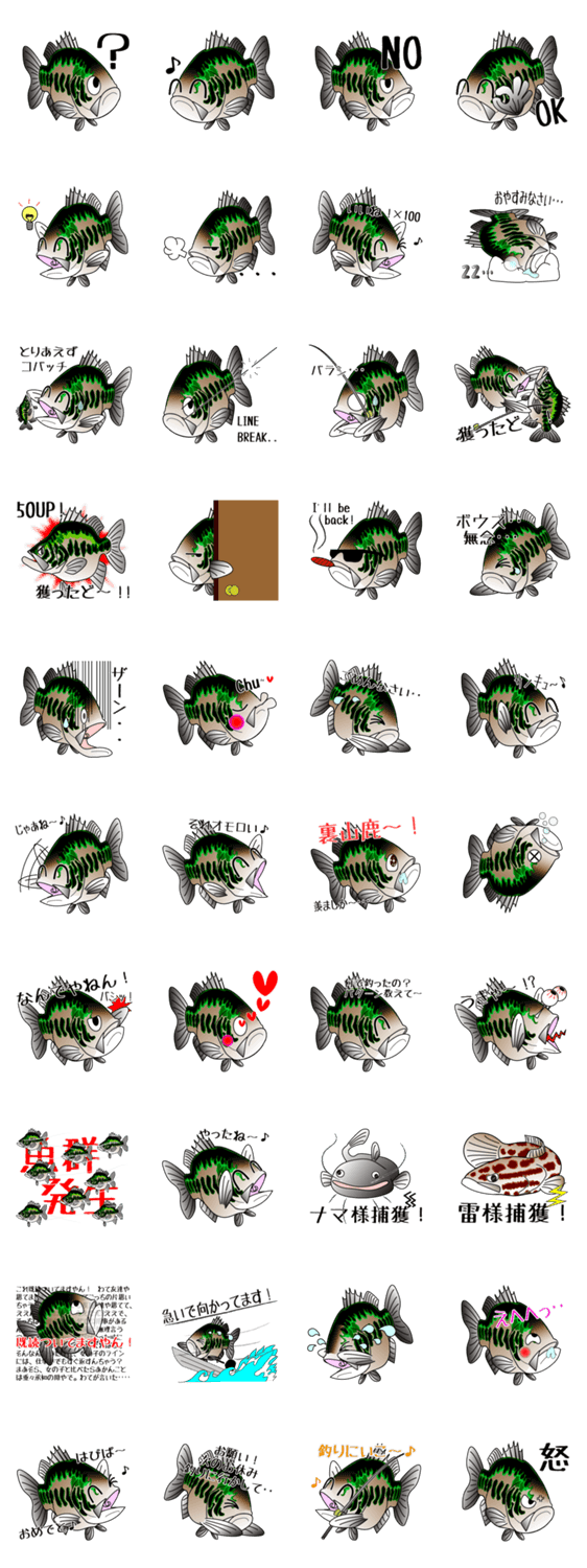 釣りスタンプ★ブラックバス AHO AHO BRAINS - ahoaho U-kun コメントをどうぞ ルアー釣り、ブラックバスのスタンプです。釣りに関する専門用語を盛り込みました。ルアー・ブラックバス・ライギョ・ナマズなど。釣り会話にお役立て下さいね。 このスタンプどう思う?!↓クリックで投票♪好き (0)かわいい (0)かっこいい (0)おもしろい (0)使いやすそう (0)欲しい (0)萌え (0)ほっこりする (0)おしゃれ (0)ゆるい (0)こわい (0)ウザい (0)キモい (0)ムカつく (0)持ってる (0)癒される (0)セクシー (0)個性的 (0)私は買わない (0)誰かプレゼントして! (0) 購入・プレゼントする Facebookでシェア Twitterでシェア