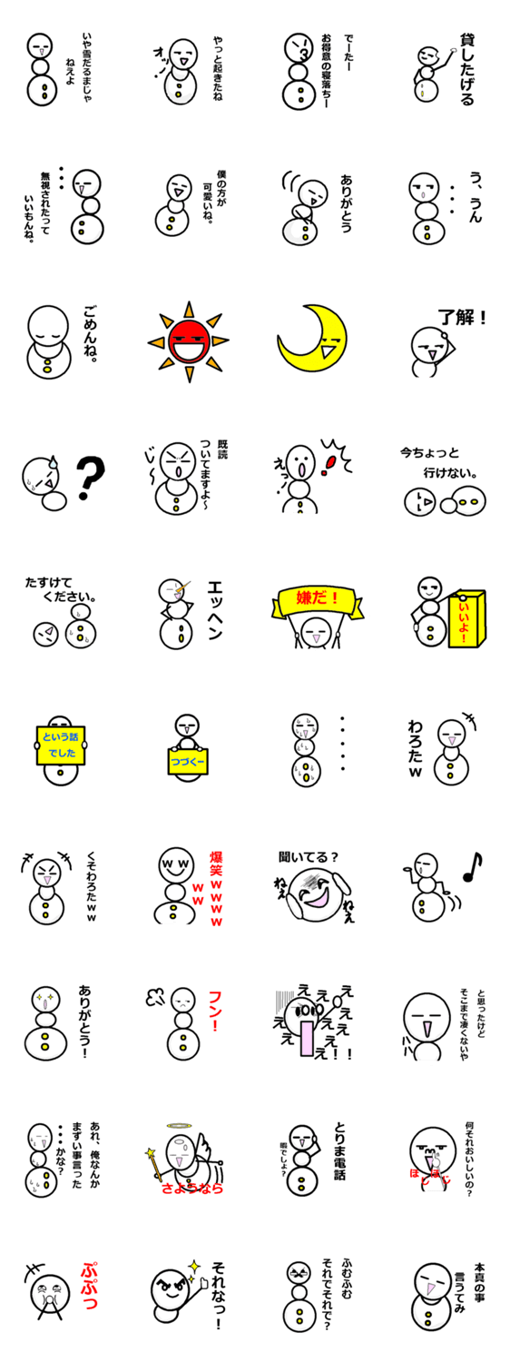 雪だるまじゃねえよ りゅうきんぐ コメントをどうぞ 雪だるまだと認めない雪だるまです。文字を打つのが疲れたり、場の空気を盛り上げたい時に是非使ってあげて下さい。 このスタンプどう思う?!↓クリックで投票♪好き (353)かわいい (340)かっこいい (6)おもしろい (73)使いやすそう (12)欲しい (120)萌え (5)ほっこりする (6)おしゃれ (5)ゆるい (5)こわい (1)ウザい (4)キモい (2)ムカつく (2)持ってる (5)癒される (7)セクシー (3)個性的 (6)私は買わない (0)誰かプレゼントして! (10) 購入・プレゼントする Facebookでシェア Twitterでシェア