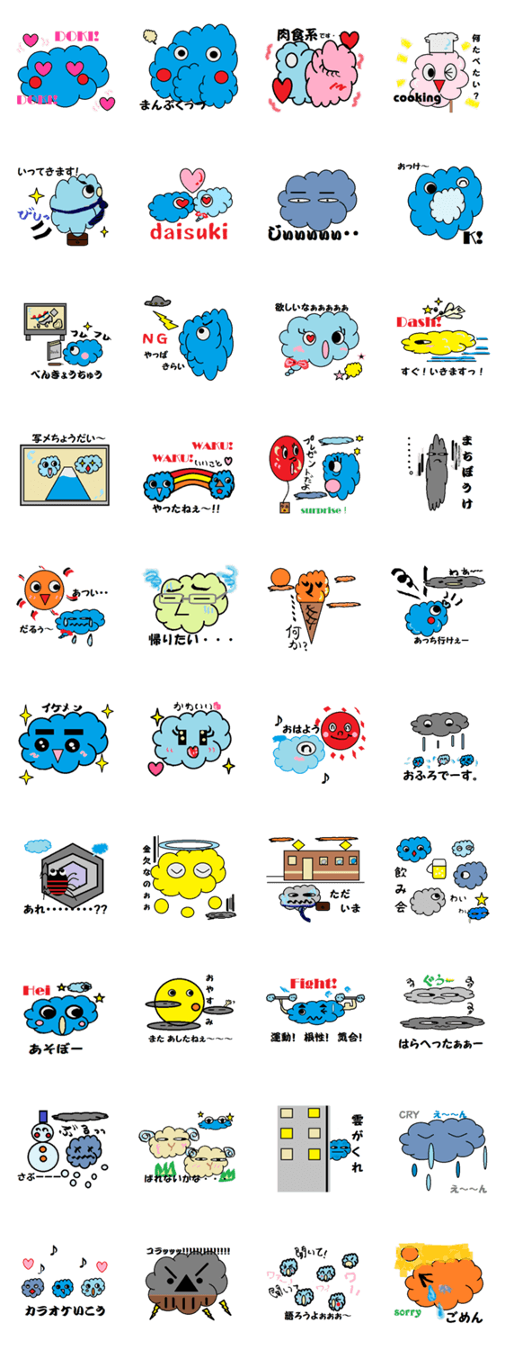 雲のき・ぶ・ん tukiko36 コメントをどうぞ 友達・大事な人・家族にスタンプで気持ち・気分・感情・しぐさや行動を伝えるスタンプです。毎日カタチが変化する雲で表現して見ました。 このスタンプどう思う?!↓クリックで投票♪好き (0)かわいい (0)かっこいい (0)おもしろい (0)使いやすそう (0)欲しい (0)萌え (0)ほっこりする (0)おしゃれ (0)ゆるい (0)こわい (0)ウザい (0)キモい (0)ムカつく (0)持ってる (0)癒される (0)セクシー (0)個性的 (0)私は買わない (0)誰かプレゼントして! (0) 購入・プレゼントする Facebookでシェア Twitterでシェア