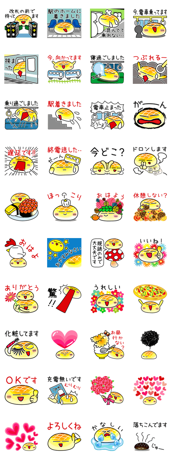 電車通勤するメロンパン こむぎ コメントをどうぞ 毎日、電車通勤する可愛いメロンパンです。毎日会社へ電車通勤されている方にお勧めです。変なメロンパン。面白いメロンパン。笑えるメロンパン。楽しいメロンパン達です。 このスタンプどう思う?!↓クリックで投票♪好き (0)かわいい (0)かっこいい (0)おもしろい (0)使いやすそう (0)欲しい (0)萌え (0)ほっこりする (0)おしゃれ (0)ゆるい (0)こわい (0)ウザい (0)キモい (0)ムカつく (0)持ってる (0)癒される (0)セクシー (0)個性的 (0)私は買わない (0)誰かプレゼントして! (0) 購入・プレゼントする Facebookでシェア Twitterでシェア