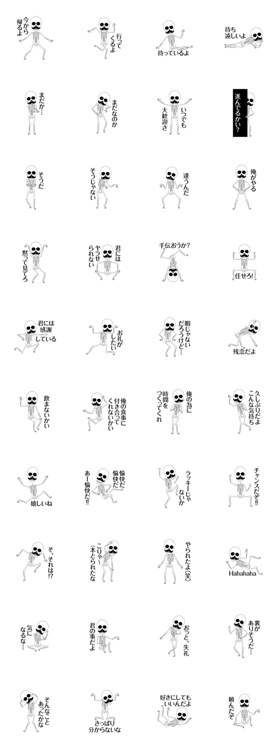 髭ダンディ骸骨 PANGRAM. コメントをどうぞ 骸骨シリーズの第11弾。彼はひげを生やしたダンディ。 このスタンプどう思う?!↓クリックで投票♪好き (0)かわいい (0)かっこいい (0)おもしろい (0)使いやすそう (0)欲しい (0)萌え (0)ほっこりする (0)おしゃれ (0)ゆるい (0)こわい (0)ウザい (0)キモい (0)ムカつく (0)持ってる (0)癒される (0)セクシー (0)個性的 (0)私は買わない (0)誰かプレゼントして! (0) 購入・プレゼントする Facebookでシェア Twitterでシェア