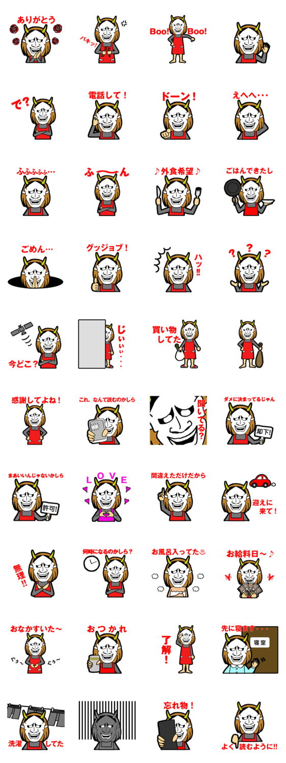 鬼嫁夜叉 kemipyon コメントをどうぞ 素顔を隠し、夜叉のお面を被った鬼嫁が叫ぶ!無表情のはずなのに、なぜか表情があるようにも見えてくる?日常会話で使いやすいスタンプを用意しました。 このスタンプどう思う?!↓クリックで投票♪好き (0)かわいい (0)かっこいい (0)おもしろい (0)使いやすそう (0)欲しい (0)萌え (0)ほっこりする (0)おしゃれ (0)ゆるい (0)こわい (0)ウザい (0)キモい (0)ムカつく (0)持ってる (0)癒される (0)セクシー (0)個性的 (0)私は買わない (0)誰かプレゼントして! (0) 購入・プレゼントする Facebookでシェア Twitterでシェア