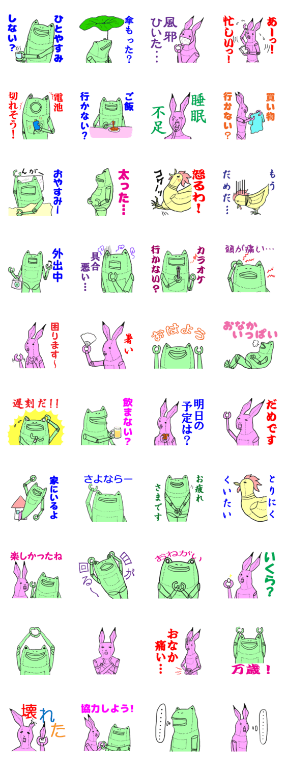 鳥獣ギガバイト げろげろげ コメントをどうぞ 鳥獣戯画に出てくるかえる、うさぎ、とりをロボットにしてみました。カエルとウサギとトリが日常で使える動きをしています。蛙、兔、鶏がお好きな方、ぜひダウンロードを。 このスタンプどう思う?!↓クリックで投票♪好き (0)かわいい (0)かっこいい (0)おもしろい (0)使いやすそう (0)欲しい (0)萌え (0)ほっこりする (0)おしゃれ (0)ゆるい (0)こわい (0)ウザい (0)キモい (0)ムカつく (0)持ってる (0)癒される (0)セクシー (0)個性的 (0)私は買わない (0)誰かプレゼントして! (0) 購入・プレゼントする Facebookでシェア Twitterでシェア
