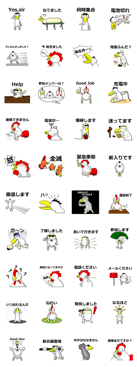 鳥軍曹 Neptune Blue Works コメントをどうぞ 戦場(職場)で戦うシュールな「ゆるキャラ」鳥の兵隊さんに命令を!毎日のトークに活用してください このスタンプどう思う?!↓クリックで投票♪好き (0)かわいい (0)かっこいい (0)おもしろい (0)使いやすそう (0)欲しい (0)萌え (0)ほっこりする (0)おしゃれ (0)ゆるい (0)こわい (0)ウザい (0)キモい (0)ムカつく (0)持ってる (0)癒される (0)セクシー (0)個性的 (0)私は買わない (0)誰かプレゼントして! (0) 購入・プレゼントする Facebookでシェア Twitterでシェア