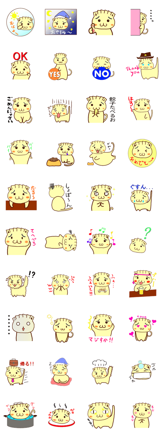 "ぎょーにゃん"餃子頭の猫 makoto コメントをどうぞ とある餃子居酒屋のマスコットキャラクター。普段は首輪をしているぎょーにゃんが、首輪をはずして皆さんのマスコットに!! このスタンプどう思う?!↓クリックで投票♪好き (0)かわいい (0)かっこいい (0)おもしろい (0)使いやすそう (0)欲しい (0)萌え (0)ほっこりする (0)おしゃれ (0)ゆるい (0)こわい (0)ウザい (0)キモい (0)ムカつく (0)持ってる (0)癒される (0)セクシー (0)個性的 (0)私は買わない (0)誰かプレゼントして! (0) 購入・プレゼントする Facebookでシェア Twitterでシェア